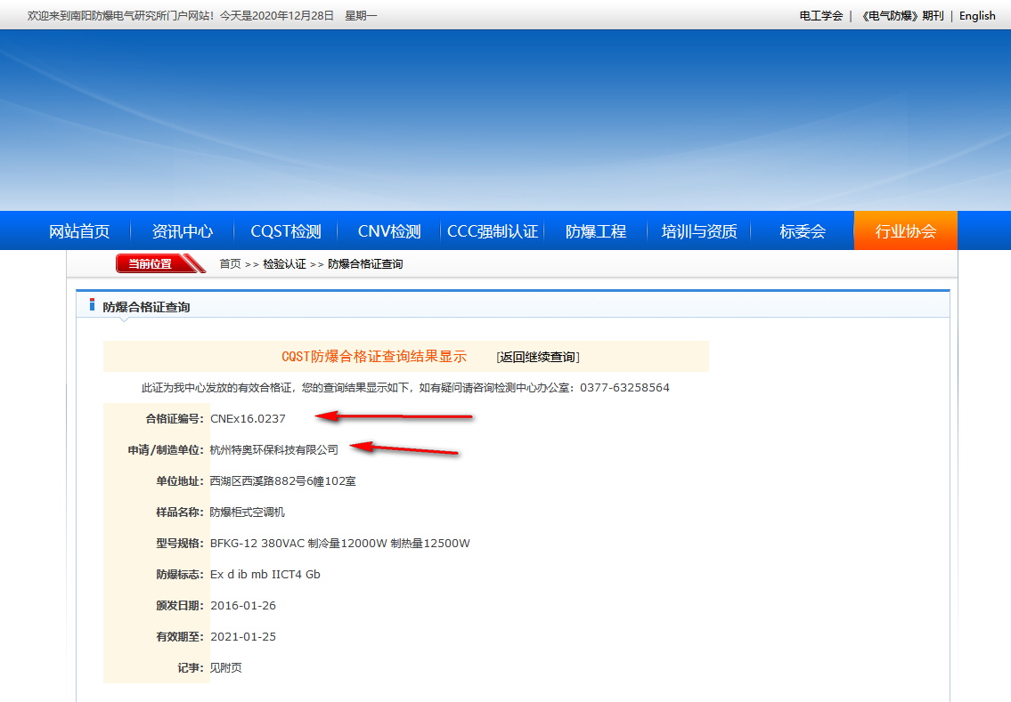 防爆合格證查詢步驟:首先登陸查詢網(wǎng)站,然后輸入合格證書編號,廠家名稱,點擊查詢即可查到防爆合格證資質(zhì)信息。一般生產(chǎn)防爆產(chǎn)品企業(yè),取生產(chǎn)許可證,需要南陽電氣研究所頒布的防爆合格證。因此,現(xiàn)以南陽頒發(fā)的防爆合格證這個網(wǎng)站查詢?yōu)槭纠?。舉例: 杭州特奧環(huán)保科技有限公司的防爆空調(diào)防爆合格證